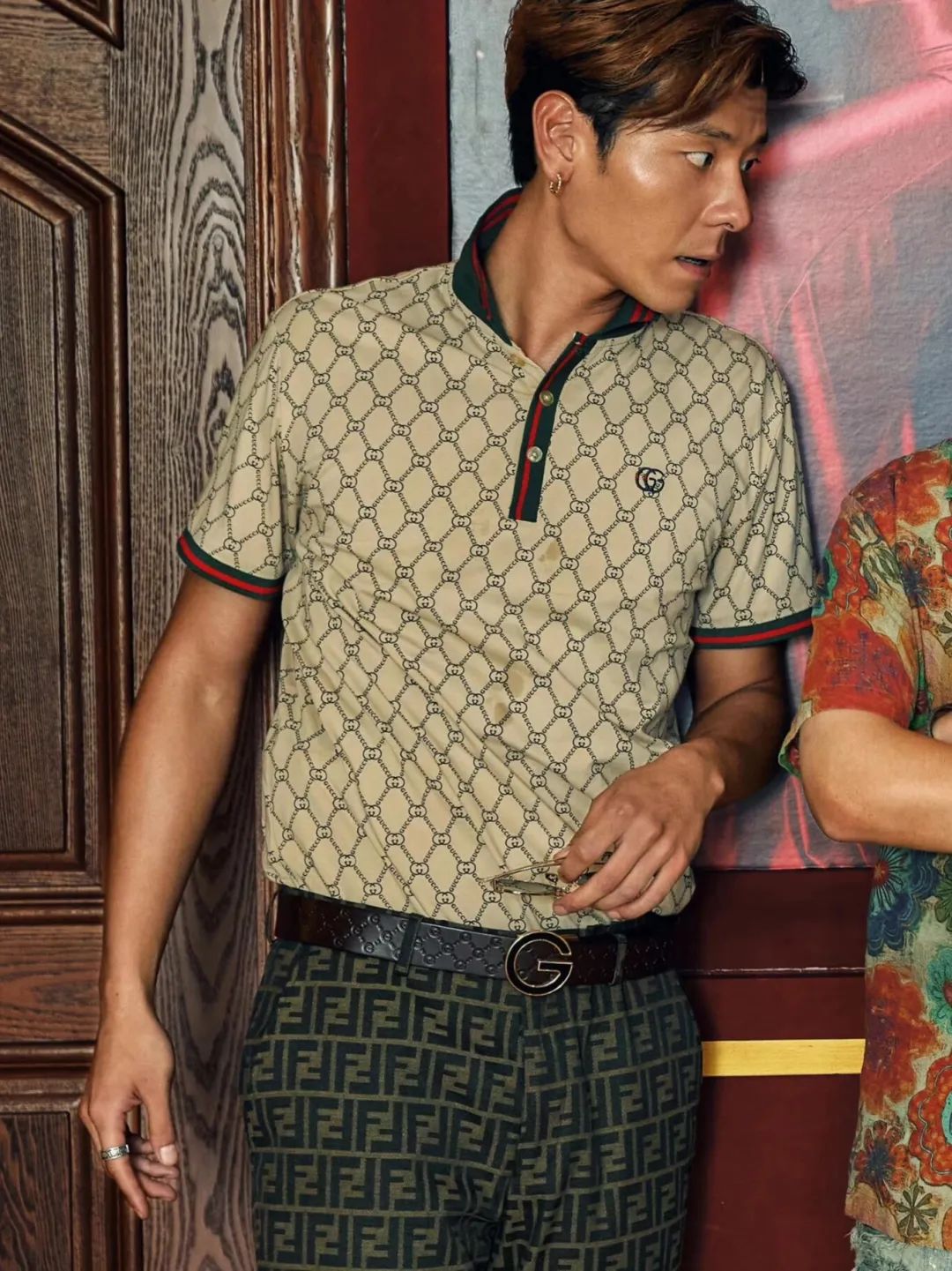 /图片来源于网络前期王安全小灵通时的穿搭以衬衫叠搭马甲配短裤为主,后期当上叠码仔后被“姐姐”宠爱,置办了新行头,穿上了名牌,LOGO铺满身,比如GUCCI的上衣搭配FENDI裤子(难辨真假),梳上大背头,戴上墨镜,张扬如暴发户。