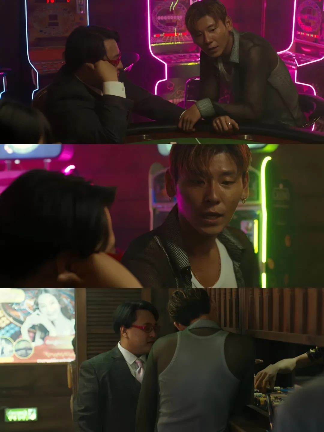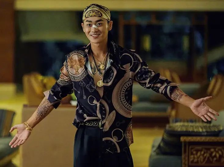 /图片来源于网络在赌场王安全引诱白社长赌博的戏份,他以白色老头衫搭配透视罩衫,一头黄毛,戴着耳环,用夹子音说起流利的韩语,是典型的不务正业坏小子形象。