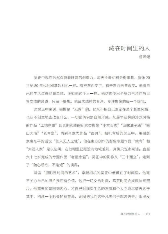 老屋余温,2018-2020年检视他的整个摄影生涯,吴正中已经活成了他想活成的样子,择一事,终一生。在漫长的人生历程当中,纷纷扰扰、举棋不定、踌躇不前总是人之常态,吴正中则向我们展示了人生的另外一种可能。他不是榜样,也不是标本,他的个案只是可以告诉我们:人,原来可以这样地活着。