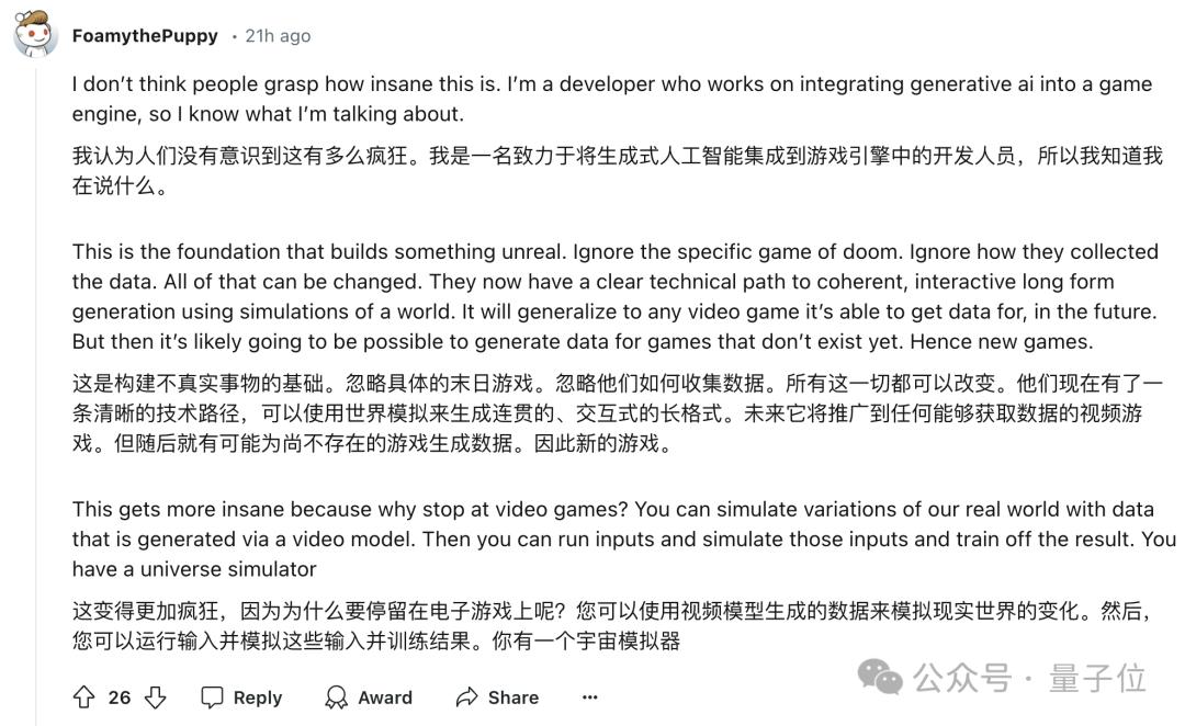 不少人表示它提供了一条全新的技术路径:我觉得人们还没有意识到这有多疯狂。我是一名开发人员,专门负责将生成式AI集成到游戏引擎中,所以我很清楚我在说什么。