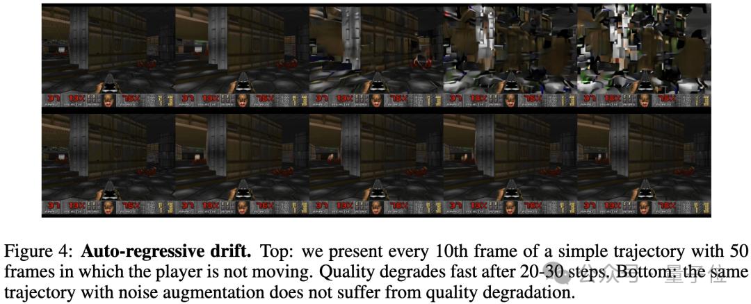 为了解决自回归生成中的误差累积,即自回归漂移问题,GameNGen引入了噪声增强技术。在训练时,模型对输入的上下文帧添加不同程度的高斯噪声,并将噪声级别作为额外输入提供给模型。这使得模型能够学习纠正之前采样中的错误,对维持长时间序列的图像质量至关重要。