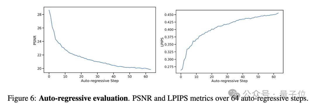 在teacher-forcing设置中,模型单帧预测质量PSNR为29.43,LPIPS为0.249。PSNR的值与20-30质量设置下的有损JPEG压缩相似。