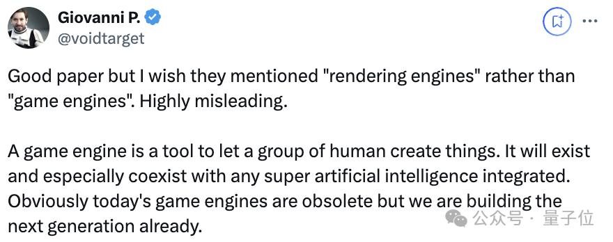 不过,在一片好评声中,也有网友指出,论文很好,但称其为“游戏引擎”不太妥当:希望他们能说“渲染引擎”而不是“游戏引擎”。