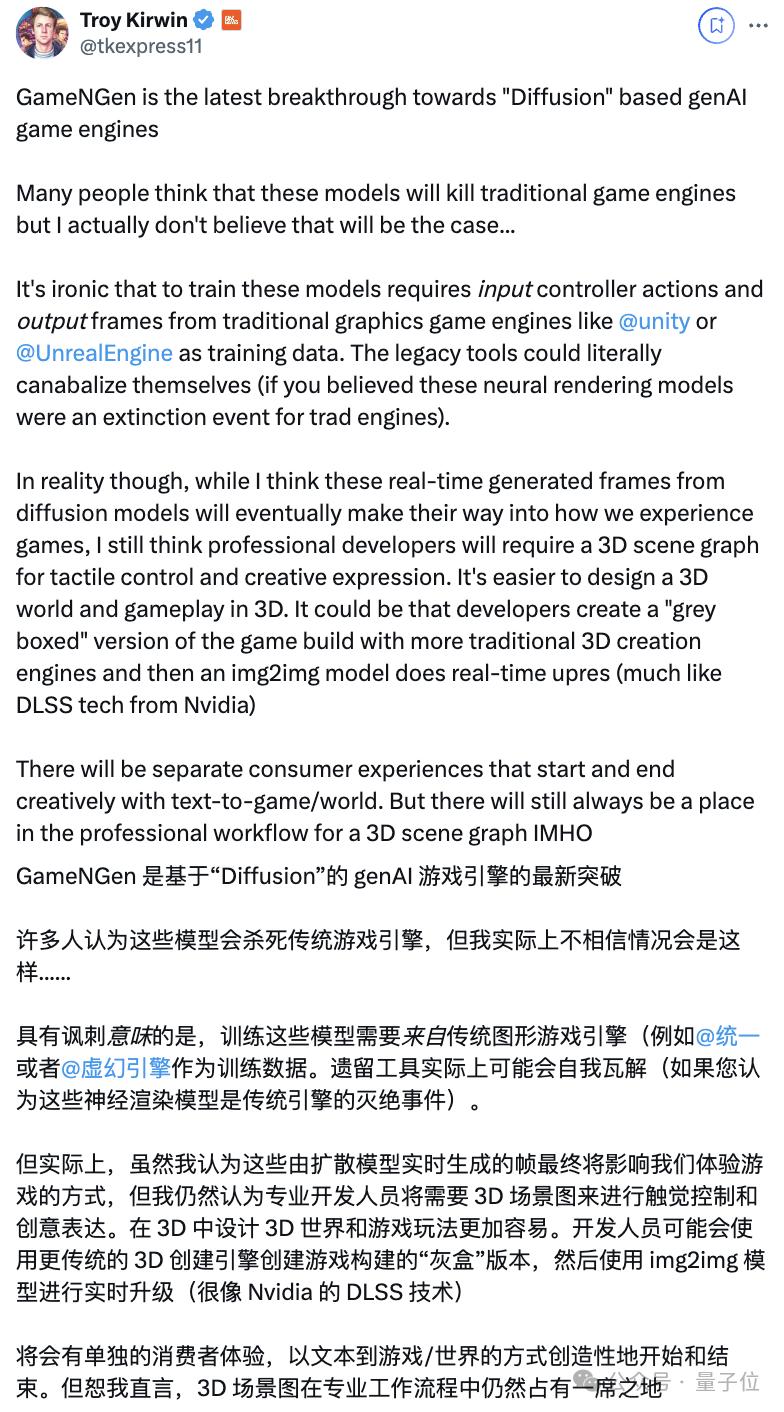 虽然我认为这些由扩散模型实时生成的帧最终会改变我们体验游戏的方式,但我仍然认为专业开发者需要一个3D场景图来进行触感控制和创造性表达。