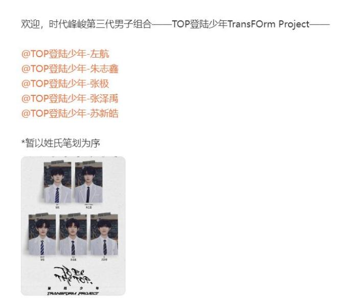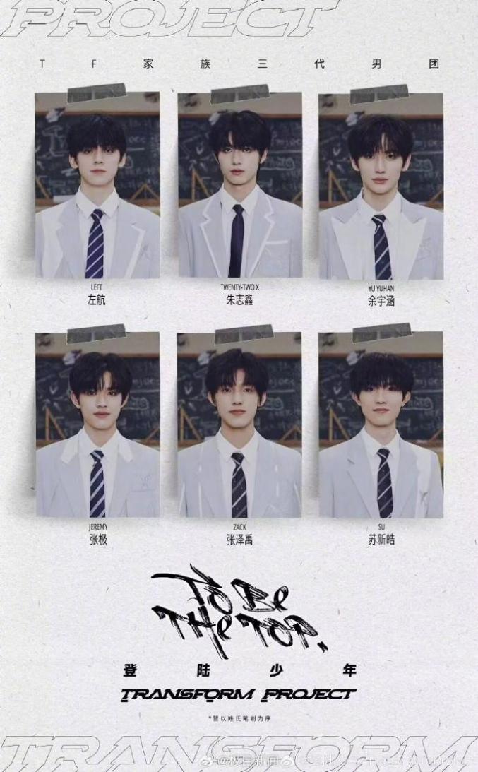 8月26日晚,TF家族三代男团宣布成团,左航、朱志鑫、余宇涵、张极、张泽禹、苏新皓6人成团。根据时代峰峻此前公告,TOP登陆少年在一年内将以平番团的形式运营,艺人排名顺序暂时按姓氏笔画为序,一年后再根据相关规则公布最终番位。成团时刻,6位少年在舞台上当着全体观众的面宣誓:“我承诺不负自己的初心梦想,不负公司的悉心培养,不负粉丝的期盼与支持,坚定团队发展,绝不中途退团,团荣誉大于个人荣誉,队友既是伙伴更是家人,坚定对粉丝、队友的承诺,恪守偶像准则,不恋爱不私联。”