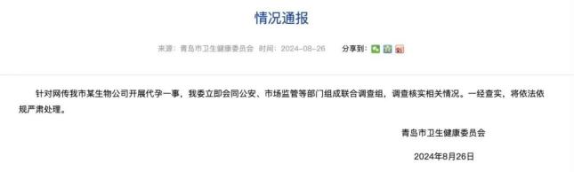 8月26日,青岛市卫生健康委员会发布情况通报:针对网传我市某生物公司开展代孕一事,我委立即会同公安、市场监管等部门组成联合调査组,调查核实相关情况。一经查实,将依法依规严肃处理。