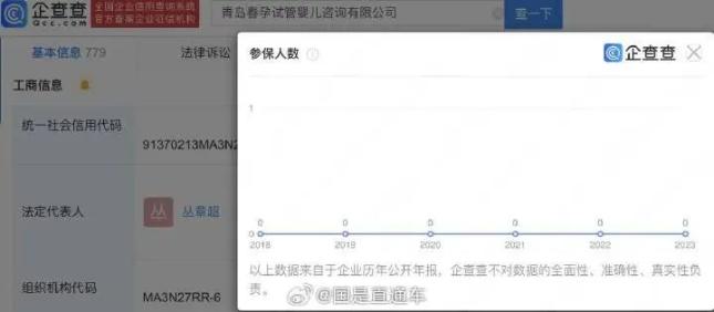 值得一提的是,丛某还关联另一家企业——青岛春孕试管婴儿咨询有限公司,该公司成立于2018年4月,注册资本100万人民币,经营范围为试管婴儿技术咨询、医疗信息中介服务,企业管理咨询、旅游信息咨询,翻译服务,由丛章超、丛新生共同持股。年报信息显示,该公司多年参保人数均为0。