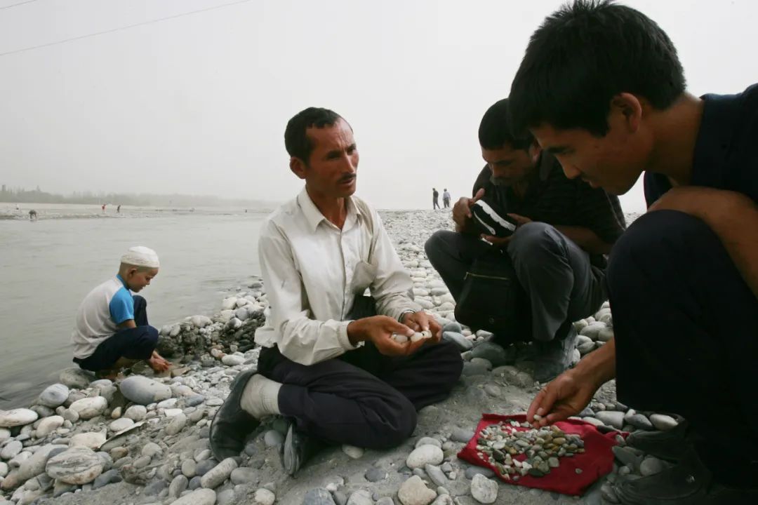 和田(新疆)- 2007年9月16日,玉龙喀什河河滩,玉石商人在讨价声中收购玉石。拾城 倪黎祥