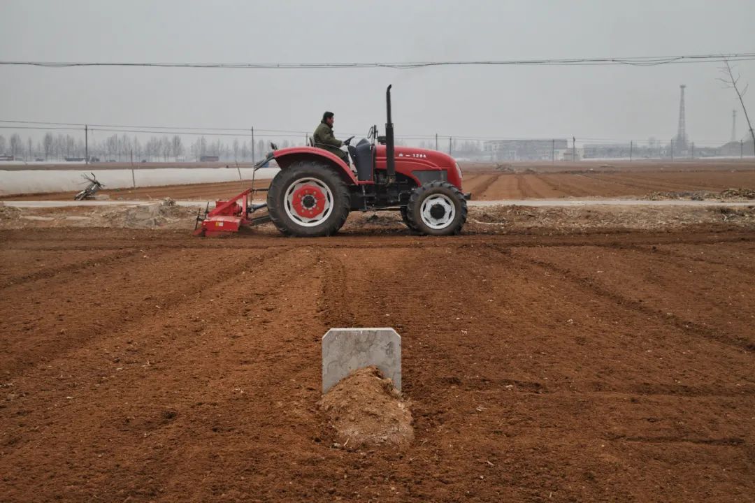 肥城(山东)- 2015年2月14日,潘庄村地里的墓碑和耕地拖拉机。拾城 刘磊