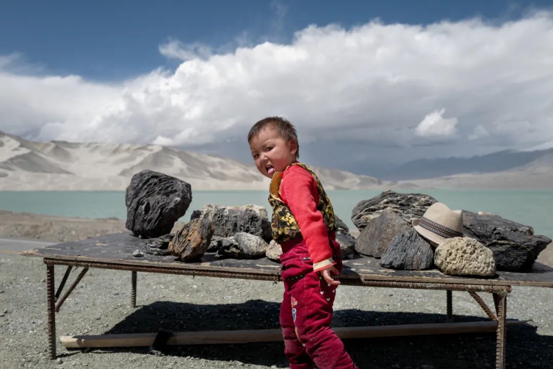 阿克陶县(新疆)- 2017年8月14日,和父亲一起在白沙湖边卖石头的小朋友。拾城 黄向华
