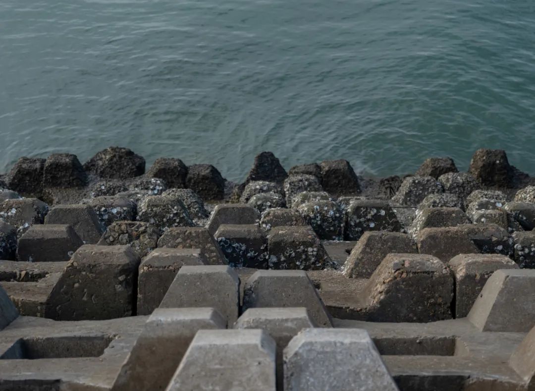 厦门(福建)-2023年12月3日,海边的消波块,不同的高度呈现不同的颜色和状态。拾城 周馨