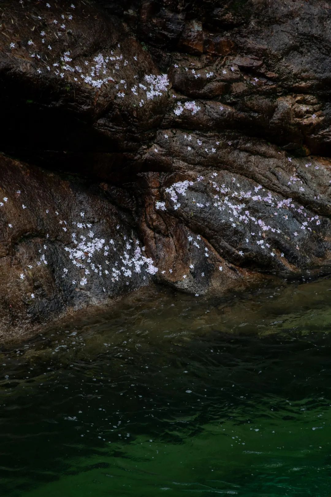 黄山(安徽)-2024年4月17,翡翠谷中,杜鹃花飘落在岩石上。拾城 周馨