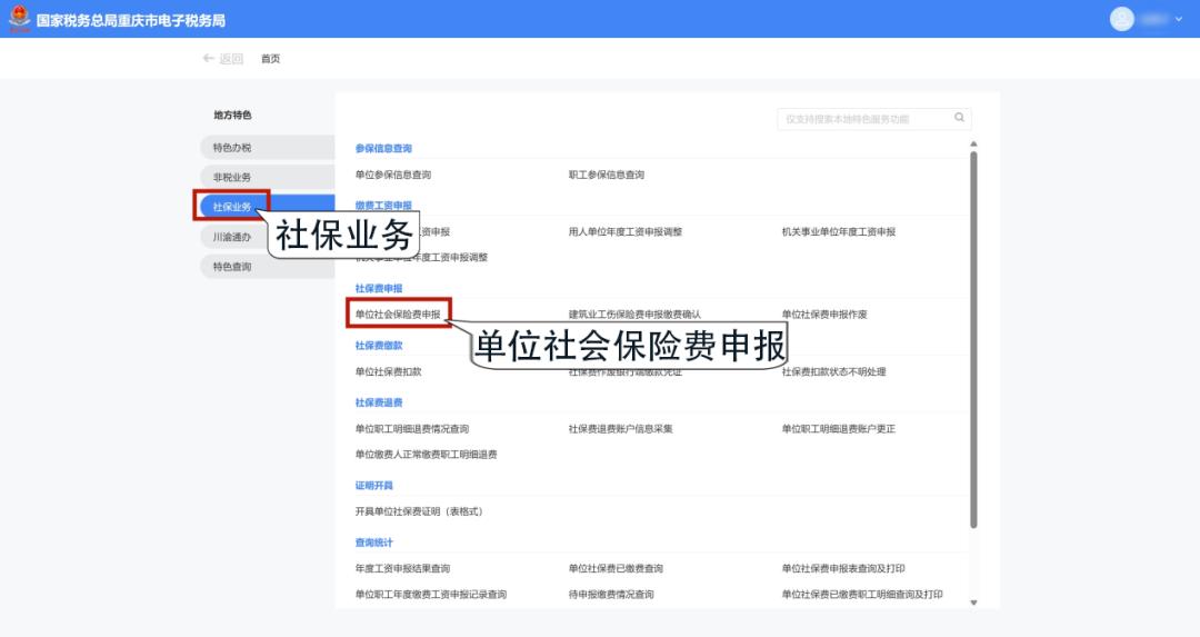 1.选择“企业业务”登录电子税务局,在首页依次点击【地方特色】-【社保业务】-【单位社会保险费申报】,进入功能页面。