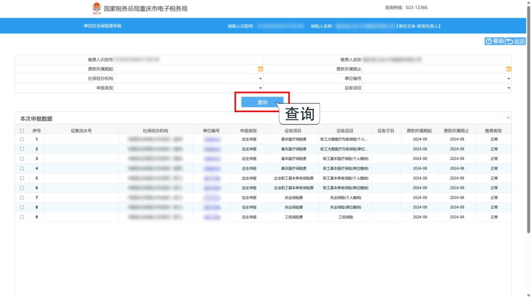 1.系统自动带出所有待申报社保费数据。若需要申报某个月份或某个险种,可录入费款所属期起止时间、申报类型、征收项目等条件,点击【查询】待申报数据。