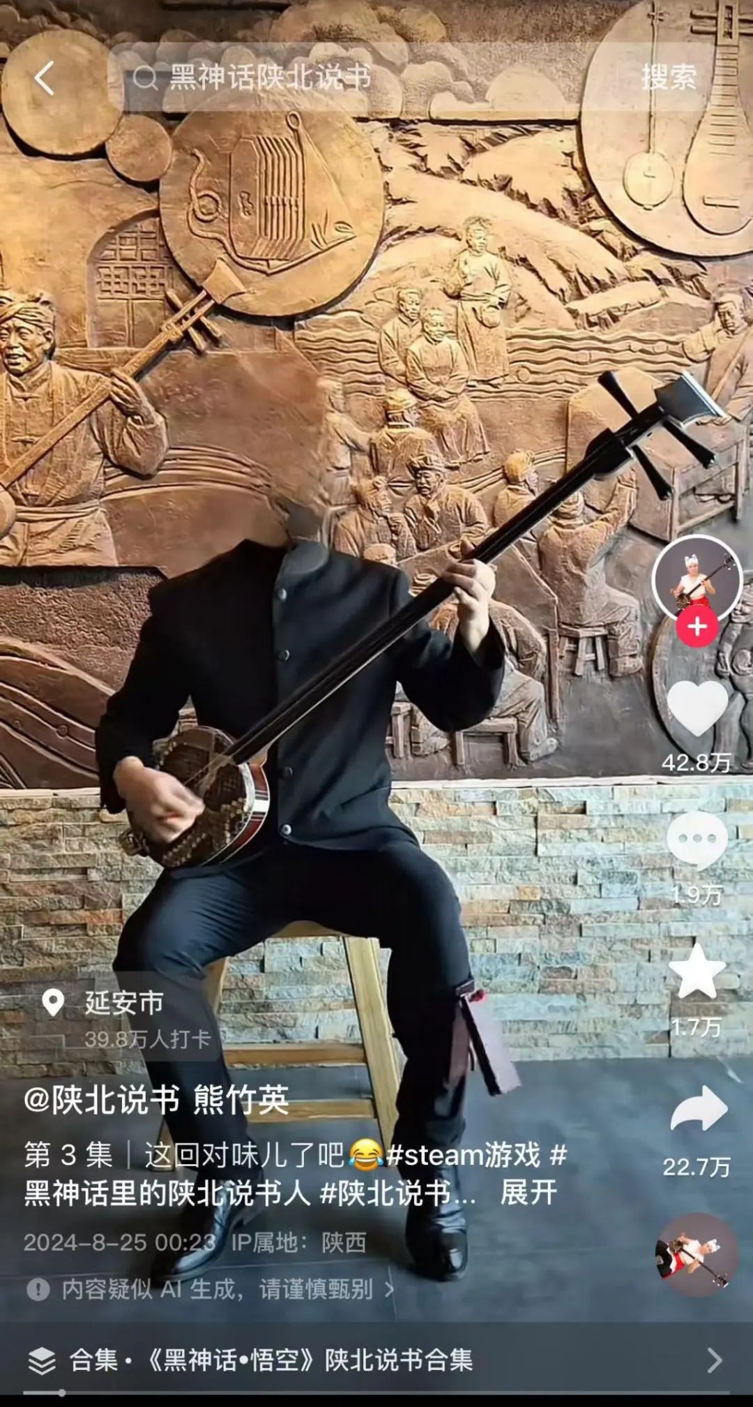 熊竹英陕北说书抖音视频《黑神话:悟空》上线后,熊竹英的陕北说书视频获得了大批玩家的点赞。抖音上最热的一条视频获得了42.8万次点赞。熊竹英说,他希望能通过各种创新方式让陕北说书这一古老的艺术形式焕发出新的活力,走向全国。《黑神话:悟空》帮助他做到了这一点。
