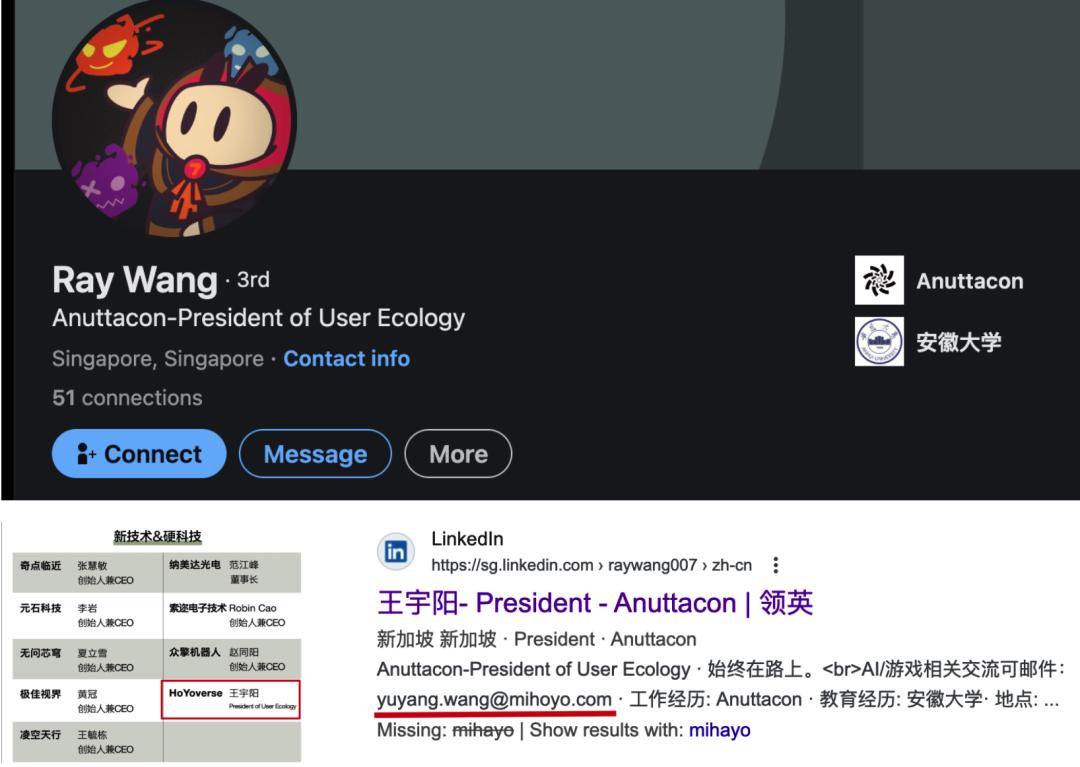 任Anuttacon用户生态总裁的Ray Wang,也就是前B站游戏和直播负责人王宇阳,在离开B站后曾以Hoyoverse身份出席公开活动,也使用过米哈游企业邮箱(现已更换为个人邮箱)。
