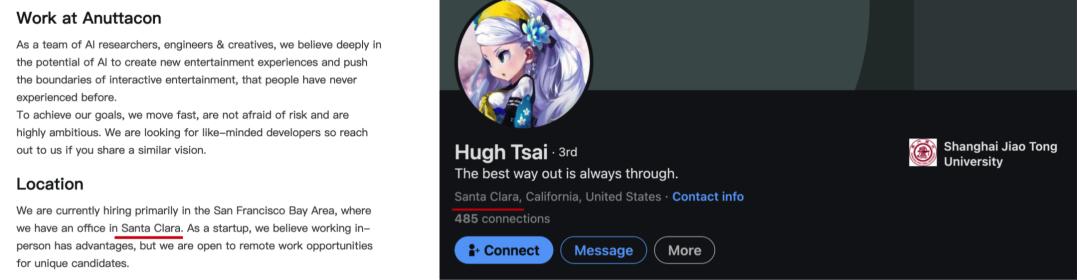 Anuttacon招聘公告称主要在旧金山湾区招聘,但在圣克拉拉设有办事处,蔡浩宇领英账号上标注的最近地点也正是圣克拉拉。