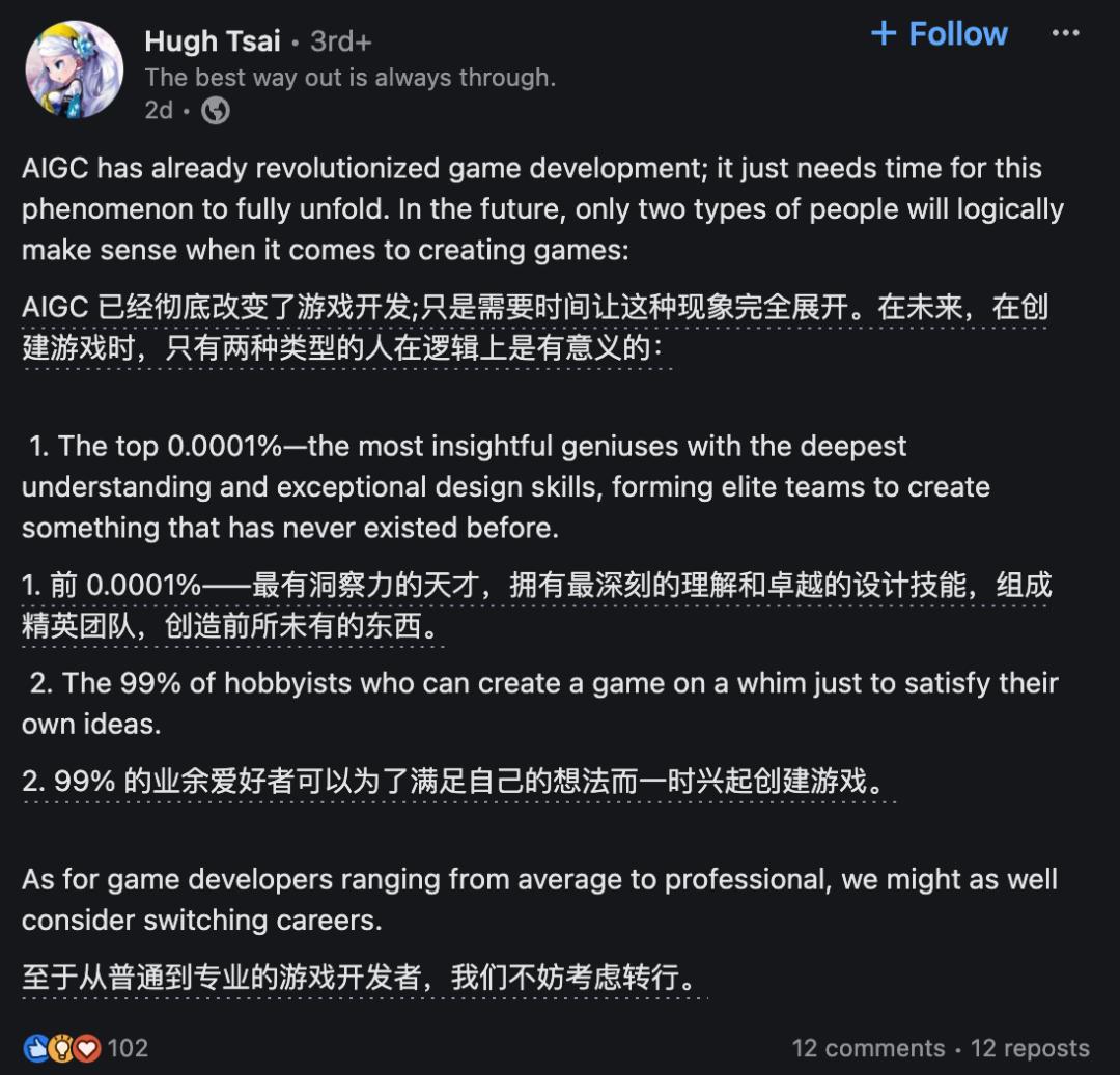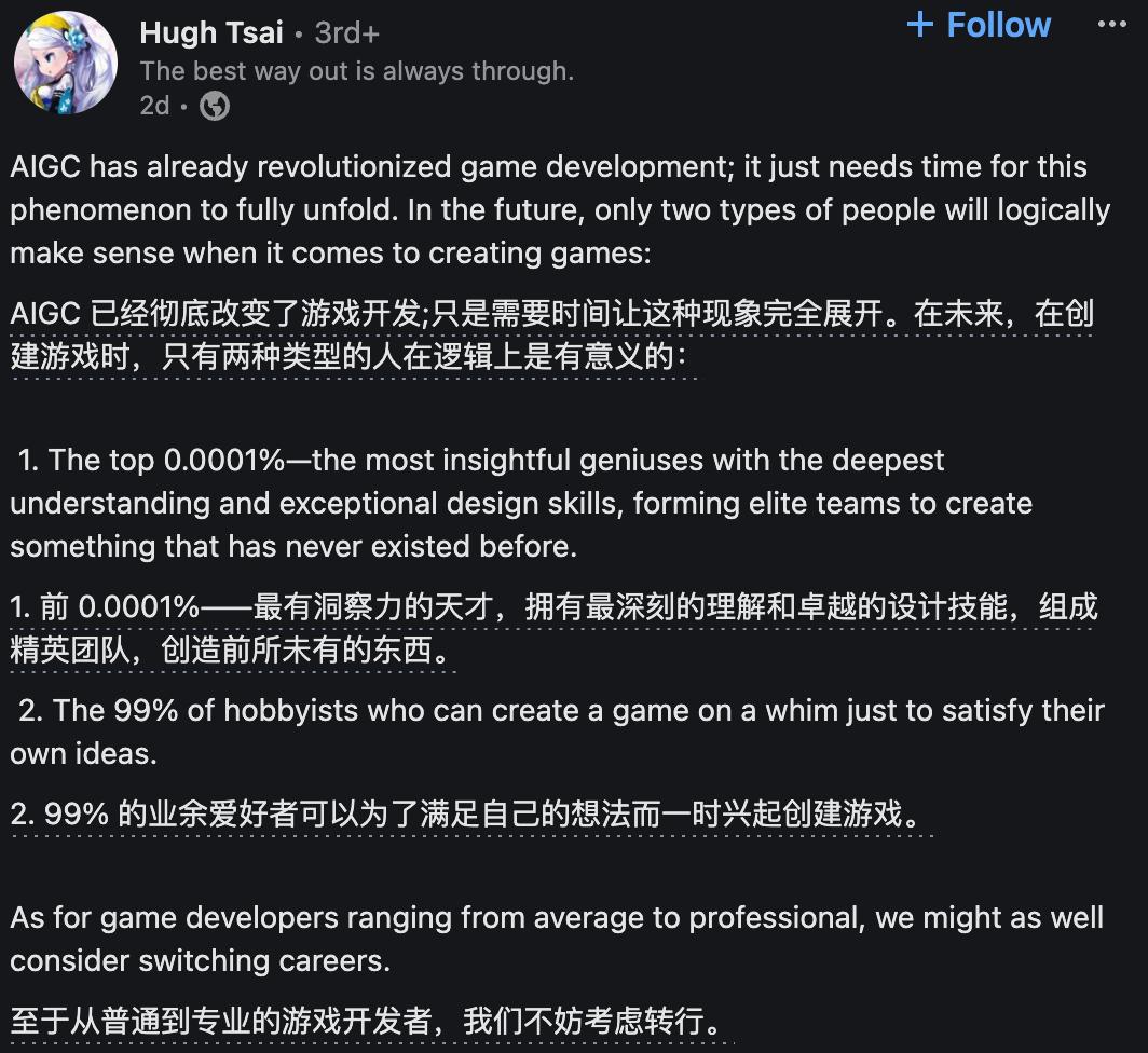 导火索2:一向低调的米哈游创始人蔡浩宇,久违的公开发表“暴论”,用AI劝退游戏从业者。