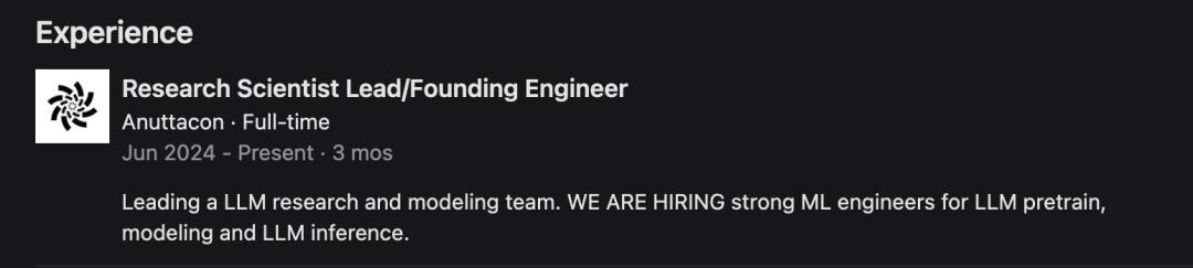 他在Anuttacon任创始工程师、大模型研究团队负责人。