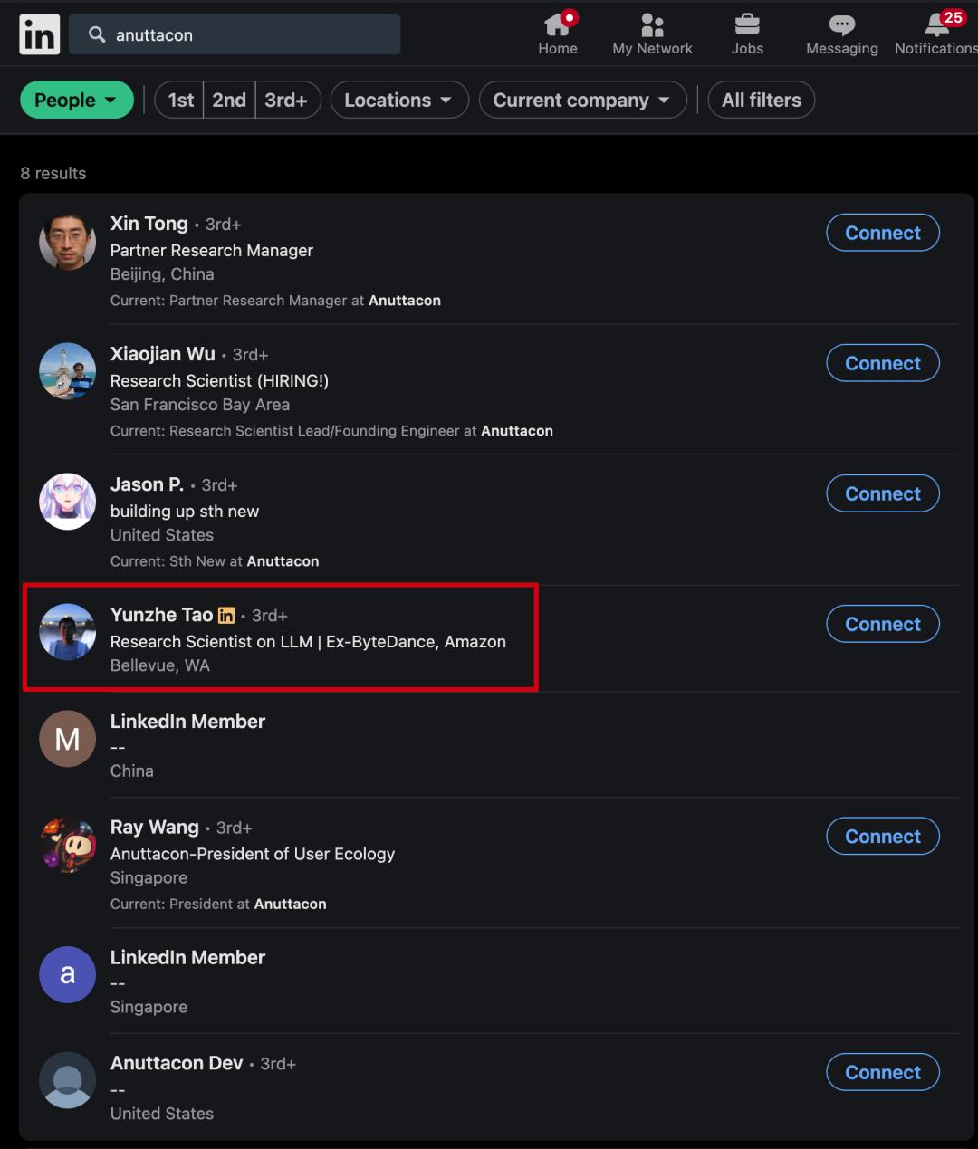 Yunzhe Tao,本人领英页面显示一个月前刚刚加入一家“隐形创业公司”,但搜索Anuttacon的话他会与童欣、吴箫剑一起出现在结果之中。
