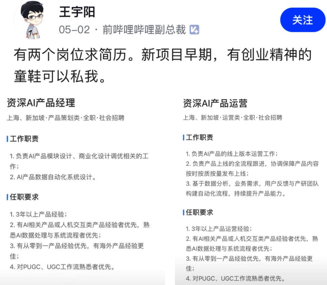 今年5月,他曾在脉脉上发布招聘“资深AI产品运营”和“资深AI产品经理”两个岗位,工作地点也包括新加坡。