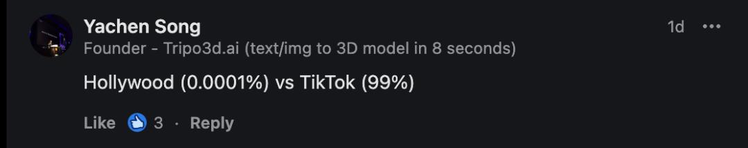 AI 3D内容生成公司VAS创始人宋亚宸补充道,蔡浩宇说的前0.0001%相当于好莱坞大片,那么99%就类似现在人人都可以拍视频的抖音。