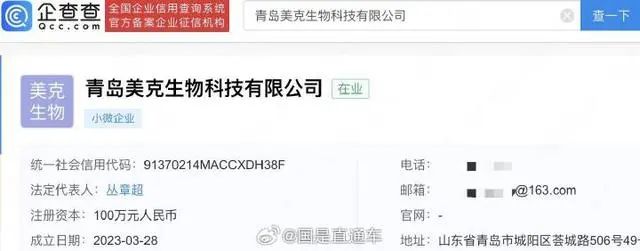 企查查APP显示,报道中提及的青岛美克生物科技有限公司成立于2023年3月,注册资本100万人民币,法定代表人为丛章超,经营范围含细胞技术研发和应用、医学研究和试验发展、人体基因诊断与治疗技术开发等,由丛章超、石鹏共同持股。2023年年报显示,该公司参保人数为2。