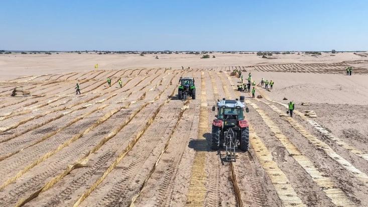 今年的3月中旬,扎鲁特旗在查布嘎图苏木乃林嘎查打响了2024年科尔沁沙地歼灭战“第一枪”。项目采取“企业+合作社+农牧户”模式,通过工程固沙、免耕补播、人工播种、灌木栽植等工程措施补播优良牧草,栽植乡土灌木树种,达到防风固沙,提高草原植被盖度的效果。目前,完成了7万亩沙地治理任务,实现了从“沙进人退”到“绿进沙退”翻天覆地的变化。“以前都是白花花的沙子,现在变成绿草地了,生态恢复的可好了,我打心底里高兴。”乃林嘎查牧民李卫东说。