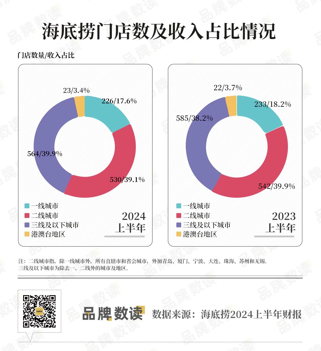 可以看到,海底捞在一线、二线以及下沉市场都有不同程度的关店,其中三线及以下涵盖最广,关店也最多有21家店,虽然门店减少了但收入占比却提升了近2个百分点。