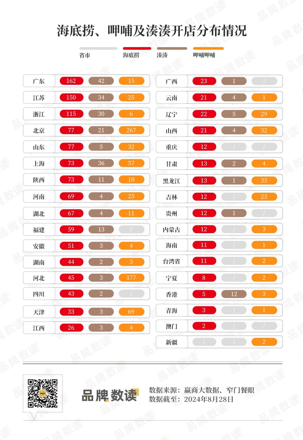 品牌数读也梳理了海底捞、呷哺及湊湊三个品牌的开店分布,数据显示呷哺和湊湊在华南的门店确实在增多,同时在中国香港等地,呷哺集团的门店数属于净增长状态。