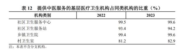 2023 年,全国中医类医疗卫生机构床位173.2 万张,其中:中医类医院 134.7 万张(占77.8%)。与上年比较,中医类医疗卫生机构床位增加 14.4 万张,其中:中医类医院床位增加 8.8 万张。2023 年,提供中医服务的社区卫生服务中心占同类机构的 99.6%,社区卫生服务站占94.2%,乡镇卫生院占99.6%,村卫生室占 82.9%。