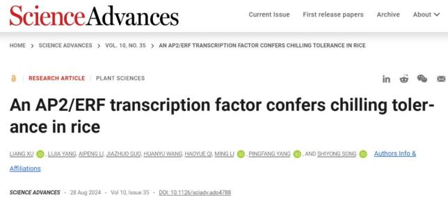 2024年8月28日,浙江大学农学院宋士勇研究员团队在Science子刊Science Advances上发表了题为An AP2/ERF transcription factor confers chilling tolerance in rice的研究论文,揭示了水稻乙烯响应因子OsERF52正调控水稻耐冷性的分子机制。该研究不仅加深了对水稻低温胁迫响应机理的理解,也为水稻耐低温品种的遗传改良提供了新思路。