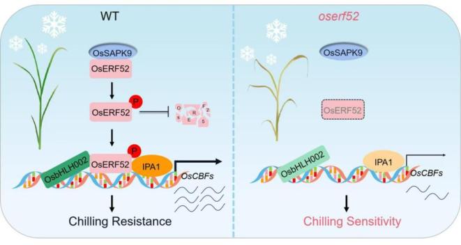 该研究通过突变体进行低温苗期表型筛选,鉴定到一个正调控水稻耐冷性的基因OsERF52。RNA-Seq,EMSA和双荧光素酶报告实验的结果表明,OsERF52可以直接调控OsCBF1/2/3等低温相关的关键基因来响应低温胁迫。进一步研究发现,OsSAPK9能够直接磷酸化OsERF52的Ser261位点促进其在低温下的蛋白积累,进而提高OsCBF1/2/3的转录水平。此外,OsSAPK9介导的磷酸化还可以增强OsERF52与OsICE1/OsbHLH002或IPA1的相互作用,协同上调OsCBF1/2/3的表达,最终提高水稻对低温胁迫的耐受力。值得一提的是,通过碱基编辑获得的OsERF52S261D植株在提高水稻耐寒性的同时,大田产量相关农艺性状并没有受到明显影响。总之,该结果不仅有助于从转录调控和转录后调控层面深入了解水稻抗寒性分子机制,而且为水稻抗寒遗传改良提供了潜在的基因资源。