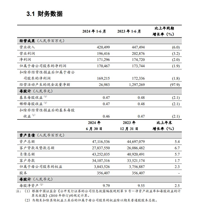 ▲工商银行2024半年度报告截图建设银行、农业银行、中国银行、邮储银行、交通银行分别实现营收3859.65亿元、3668.35亿元、3170.76亿元、1767.89亿元、1323.47亿元;归母净利润分别为1643.26亿元、1358.92亿元、1186.01亿元、488.15亿元、452.87亿元。