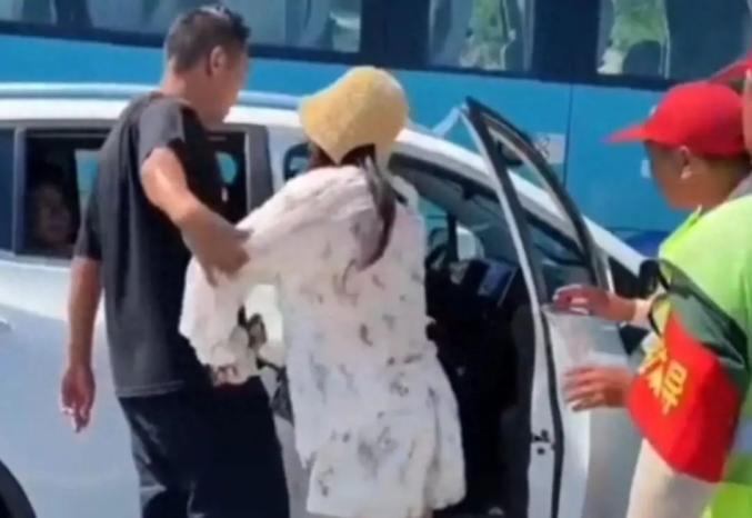 她回车上之后,交通疏导人员过来劝阻,问她为什么要逆行。她与工作人员争吵,推搡对方,又在倒车时与前方的旅游大巴车发生剐蹭,接下来的事情被旁边一位游客拍到,就是网传视频里那样。