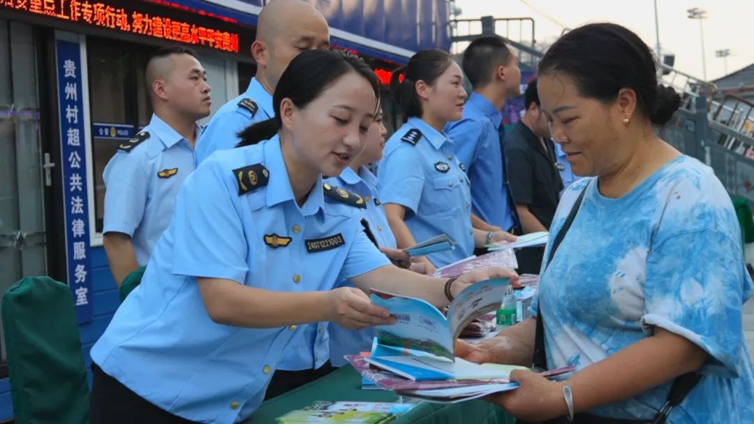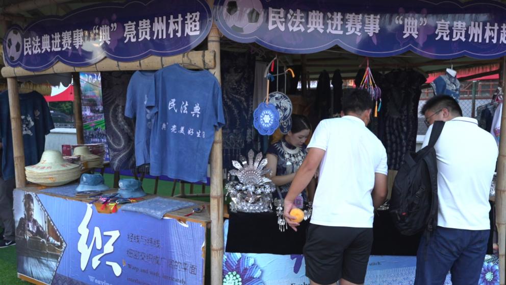 在“村超”赛场内,设置有民法典宣传区,普法志愿者为前来观赛的球迷宣传民法典知识、展示“村超”品牌保护,并发放民法典、村民应知应会法律手册等普法宣传资料。非遗传承人将法治文化融入非遗技艺蜡染,为“村超”赛事增添了浓厚的法治氛围。为提升群众参与度,现场还组织了法律知识有奖竞答,法治文艺宣传队在中场休息期间带来了侗族琵琶弹唱《民法典——“典”亮美好生活》,让参赛人员、观赛群众在轻松愉快的比赛中,寓教于乐、潜移默化的学习相关法律法规知识。