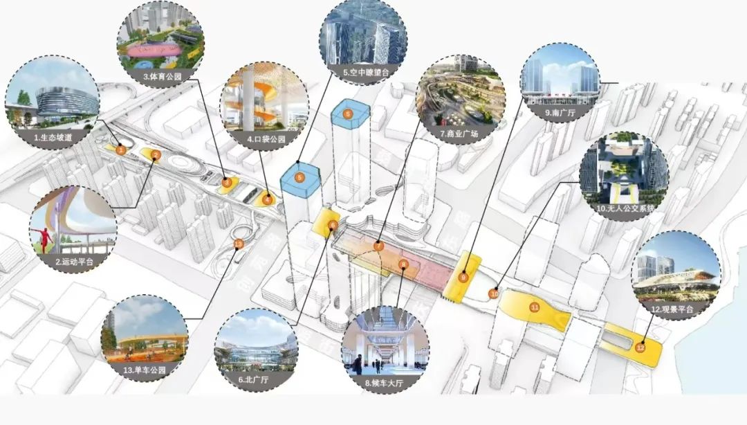 项目充分利用地上、地下及空中空间,将商业、办公、居住、绿地、地下停车和站房六大系统实现无缝连接与互通,不同业态在同一空间中和谐共存,不同标高在此巧妙折叠,将极大提升城市运行效率和居民生活质量。
