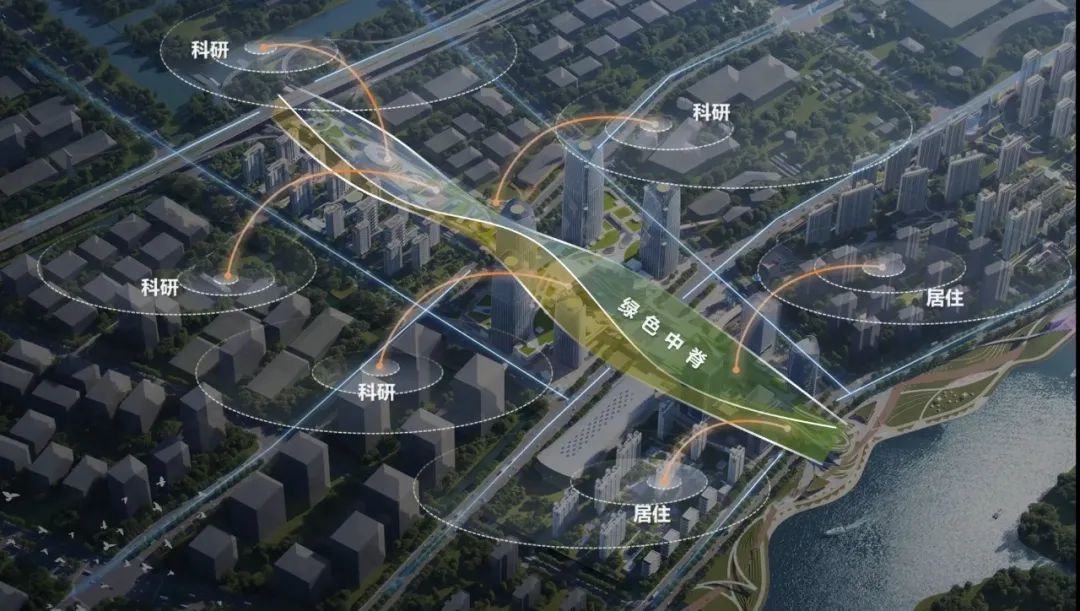 以苏州东站壮观的绿色中脊为基础,进一步联动周边地块,精心编织了一个集居住生活、文体休闲、商业酒店、研发办公于一体的多元化功能网络。