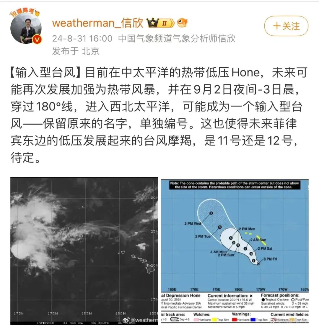 此外,还有一个输入型台风也正在酝酿。目前在中太平洋的热带低压Hone,未来可能再次发展加强为热带风暴,并在9月2日夜间-3日晨,穿过180°线,进入西北太平洋,可能成为一个输入型台风——保留原来的名字,单独编号。这也使得未来菲律宾东边的低压发展起来的台风“摩羯”,是11号还是12号,待定。