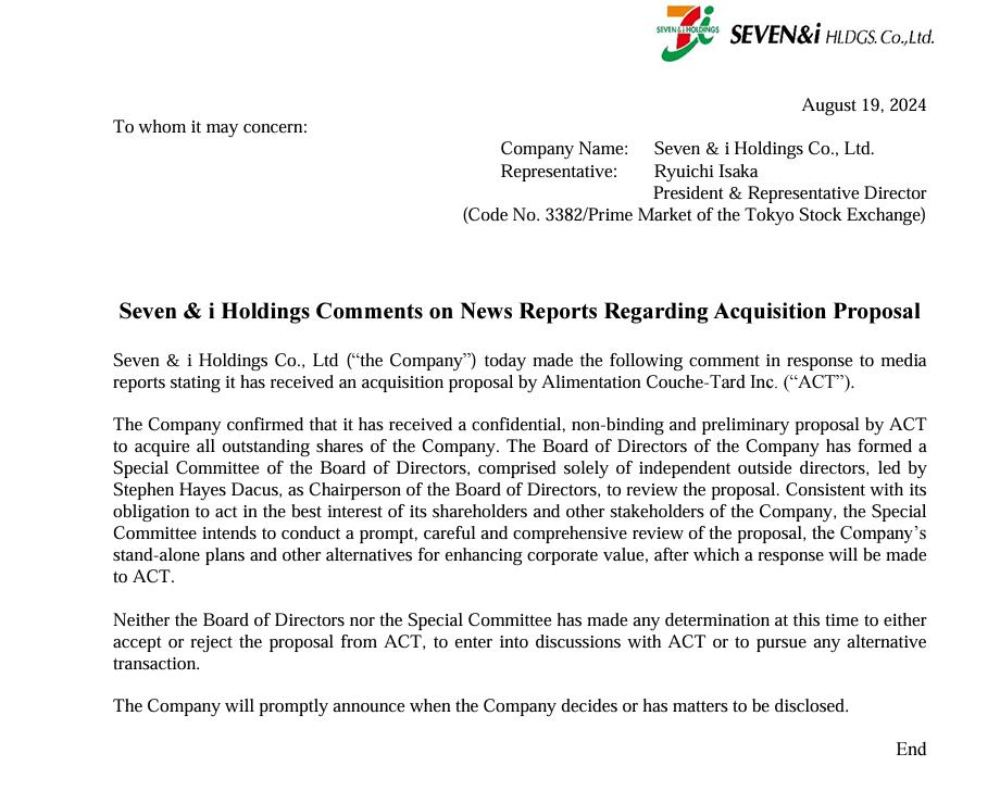 事情是这样的,有媒体报道,加拿大便利店巨头 Alimentation Couche-Tard Inc 向 7-Eleven 的母公司发起来收购要约,随后, Seven & i Holdings ( 7-Eleven 的母公司 )也出来回应说,确实有这么一回事。但目前,只是收到了要约而已,还没决定好要不要卖。