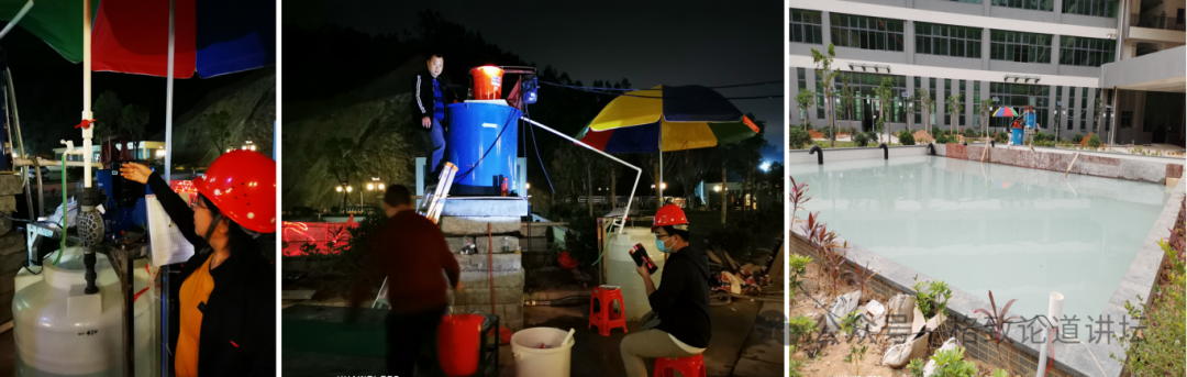 这个园区在2020年建成。建成后,我们在实验室每小时处理2吨的中试线调试成功的基础上,又在现场临时搭建了一个每小时能处理20吨的中试线进行实验。这是我们在晚上挑灯夜战的情形,还把右边的这个景观池作为沉淀池用。