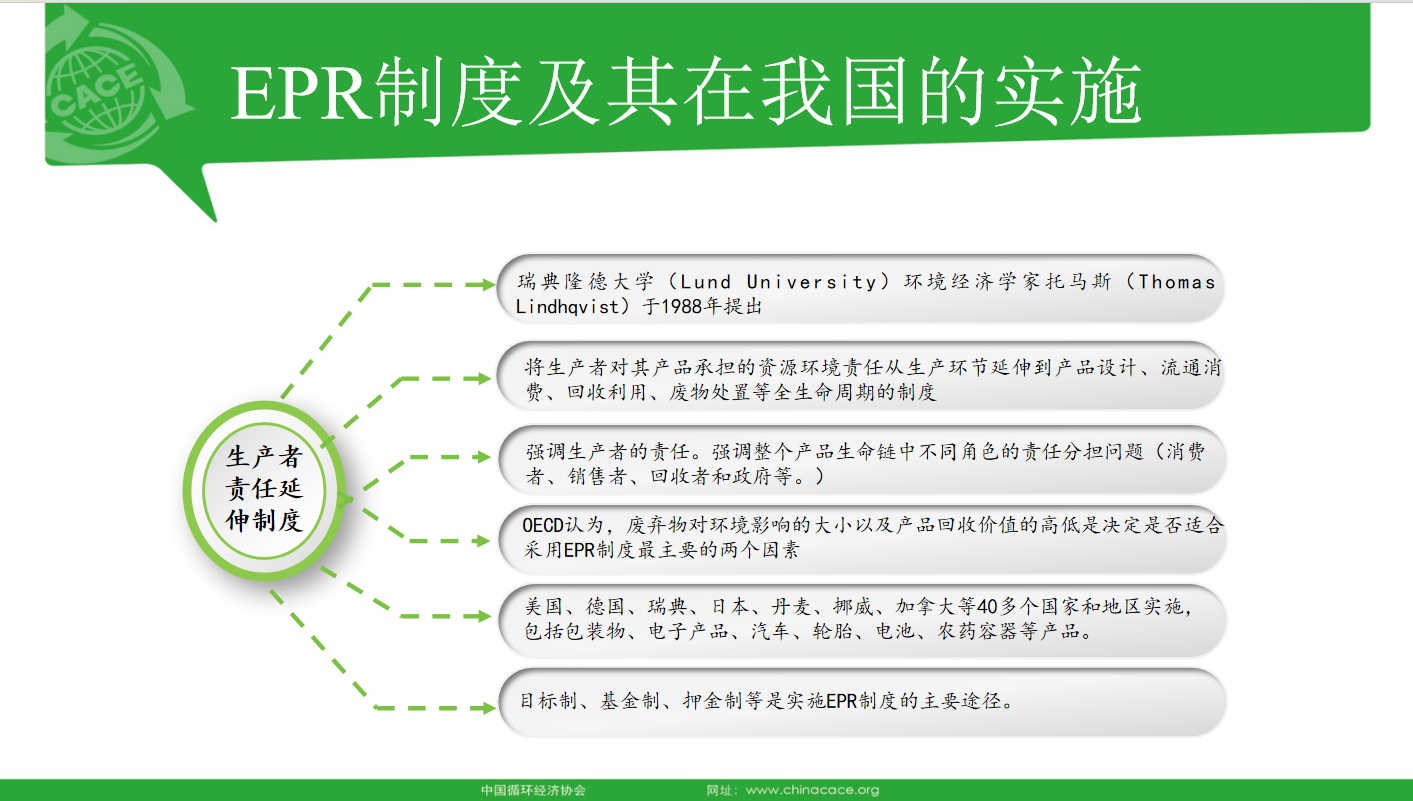 谈及生产者责任延伸制度,大家其实并不陌生。它起源于瑞典,其核心理念是将生产者对其产品的责任从生产阶段延伸至产品的整个生命周期,包括设计、生产、流通、消费、回收利用及废弃物处置等各个环节。这一制度也在美国、德国、瑞典、日本这些发达国家中得到了广泛应用,特别是在包装物、电子电器产品等领域。