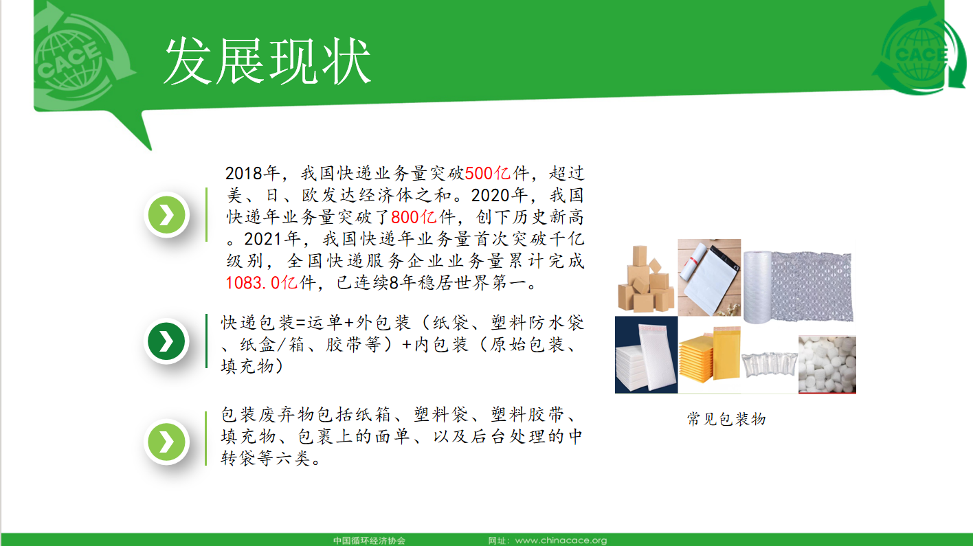 以下是中国循环经济协会的常务副会长赵凯的主旨分享全文:大家好!我是中国循环经济协会的常务副会长赵凯,非常荣幸今天能够在线上与大家共同探讨电商平台减塑话题,我将重点围绕生产者责任延伸制度(EPR)分享我们在快递物流绿色包装领域方面所做的一些研究及结论。