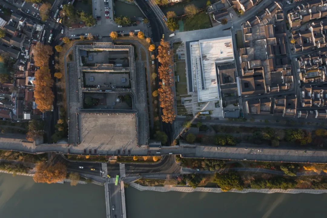 城墙博物馆与周边环境俯瞰○ “并置”是指允许差异共存。我们保留了原沈万三陈列馆的两进精华院落,并把新馆设计为“L形”与之咬合,形成一个新旧共构的整体。