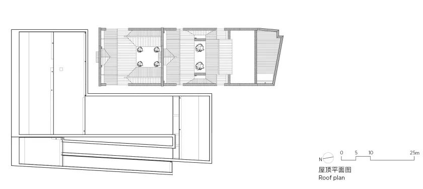 屋顶平面图○ “同构”是指形体特征与空间体验的同构。场地西侧长约90m,是博物馆主要的对外展示面,与其相对的是中华门瓮城的马道。