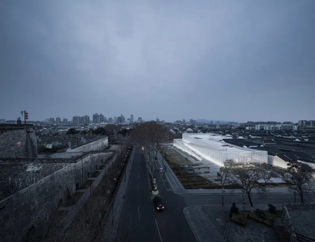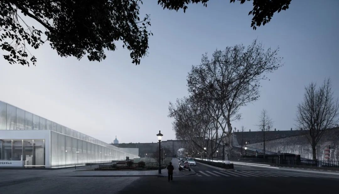 ○于是在面向城墙的立面上并没有采用砖石等材料去强化博物馆的体量感或永恒性,而是采用了一种夹胶夹网玻璃来实现模糊映射的效果。