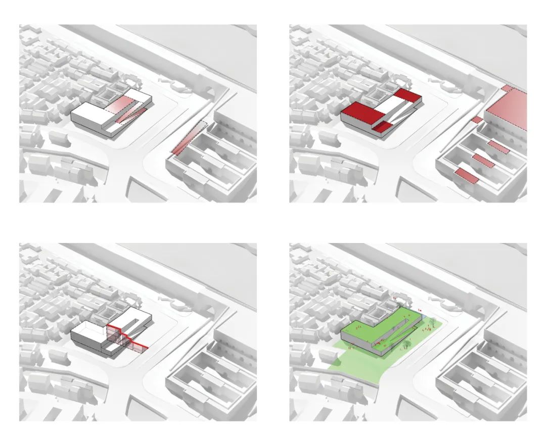 ○第二个留白是室外空间的留白。建筑的屋顶缓坡空间与地面空间共同形成全天候向市民开放的公园。平日,这里是一个供市民与游客休憩的场所;而在特殊的日子,这个面向城墙展开的屋顶空间则可以作为一个城市级的活动空间。
