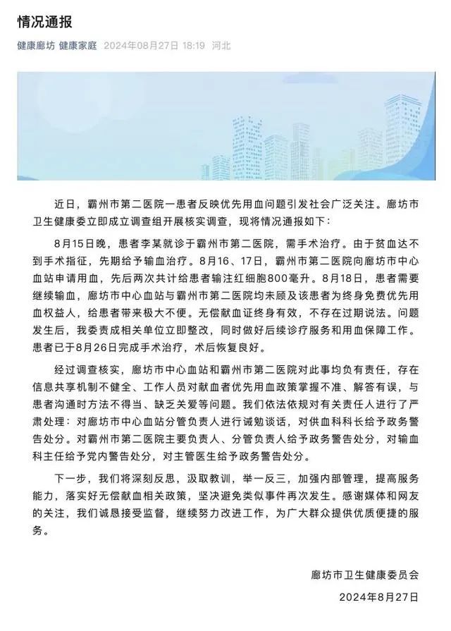 ◎ 在事件爆发的15天后,廊坊市卫生健康委员会给出了官方答复。/ 图:健康廊坊微信公众号截图这样的回答,让李先生无法接受,经过媒体报道后,更是引发了一场关于献血与用血的争议,事件在网络上持续发酵,直至近日,官方才给出了正式回应: