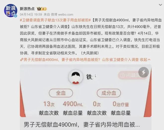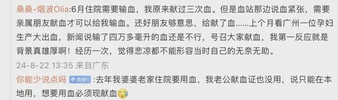 ◎ 网友在“献血者无法优先用血”事件上的留言。/ 图:网络截图之前的相关新闻更是一抓一大把,就在今年4月报道的一起献血者家属用血被拒事件:男子无偿献血13次,累计献血量4900ml,结果自己妻子省内用血,却因城市异地被拒,最终没用上。