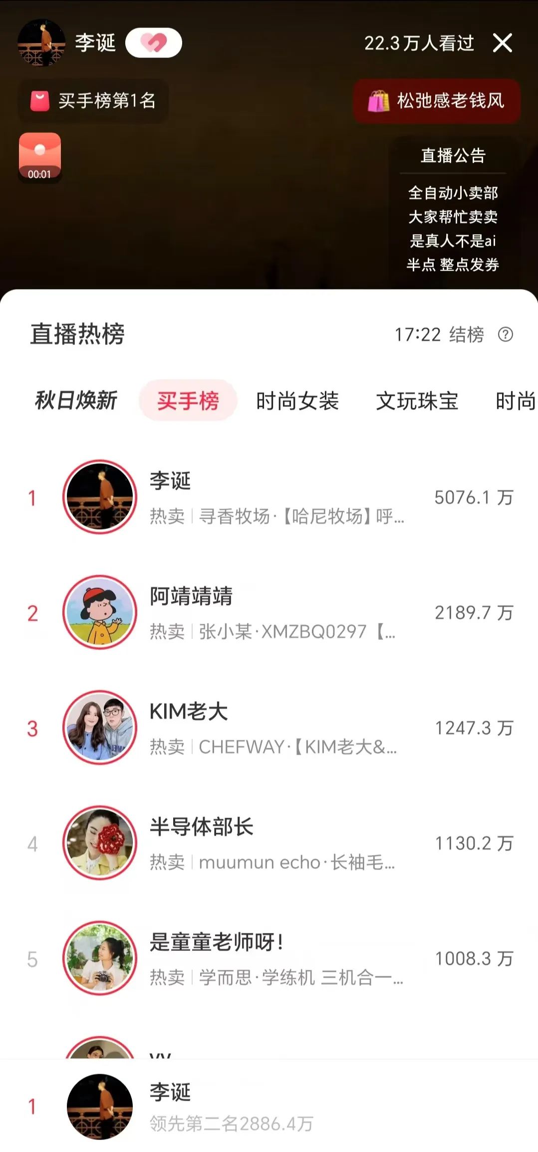 小红书直播热榜榜单是根据直播间成交金额、成交件数、观众停留时长、直播间互动率等因素排名。李诞直播间的显著特点就是,成交件数、停留时长、互动率高,但客单价较低。